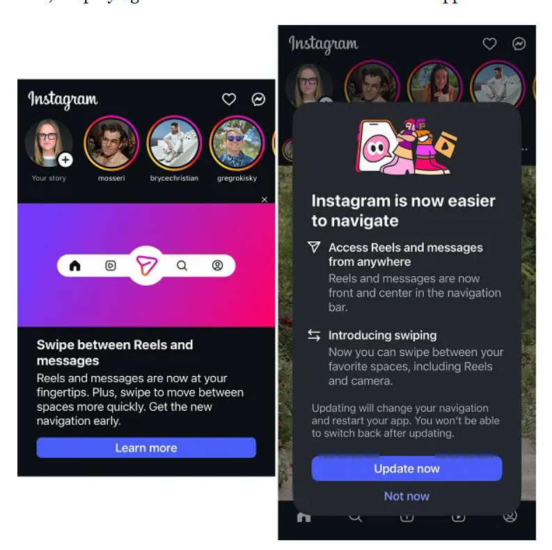 - Selected users are being prompted to try the new layout, where the first tab remains the feed/stories mix, the second is Reels, and the third is DMs.